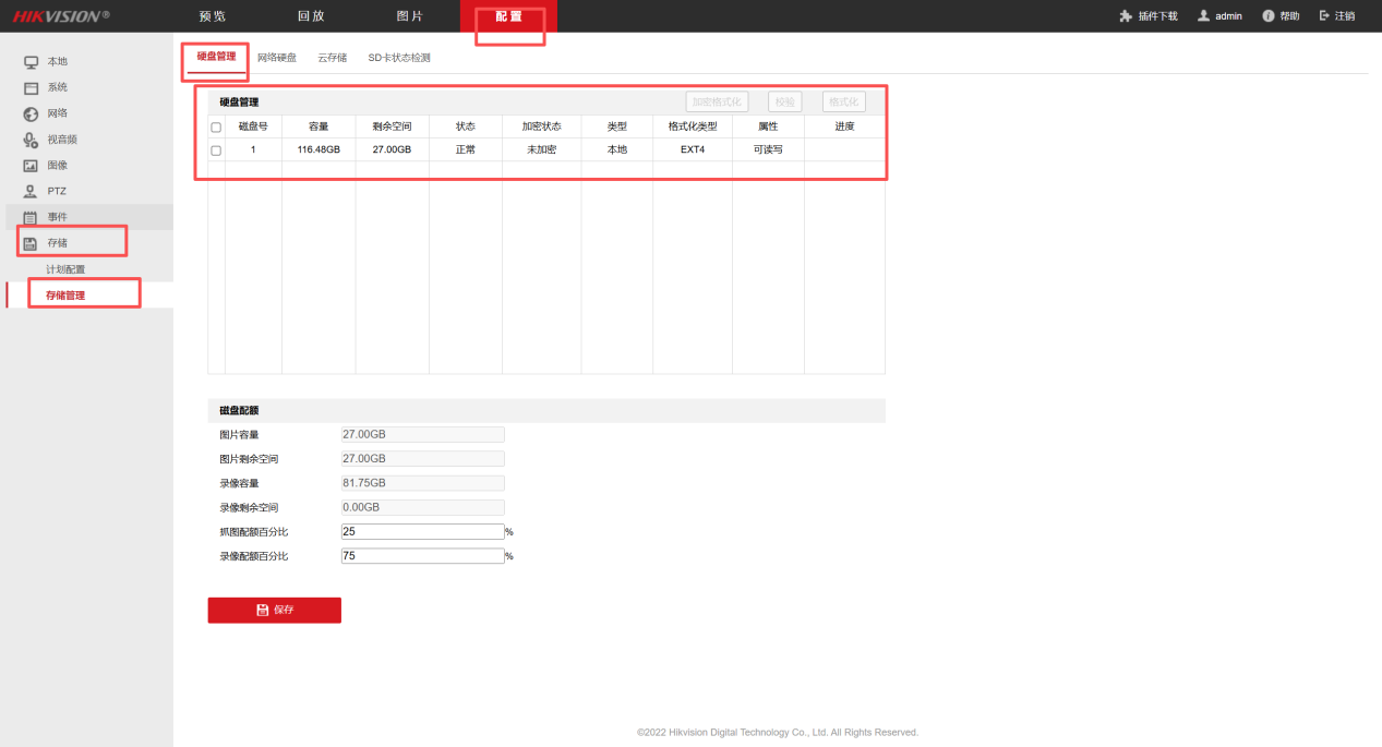 8、点击配置-存储-存储管理,看是否有硬盘或SD卡,若有且正常进行录像计划配置,启用录像,时间全天。