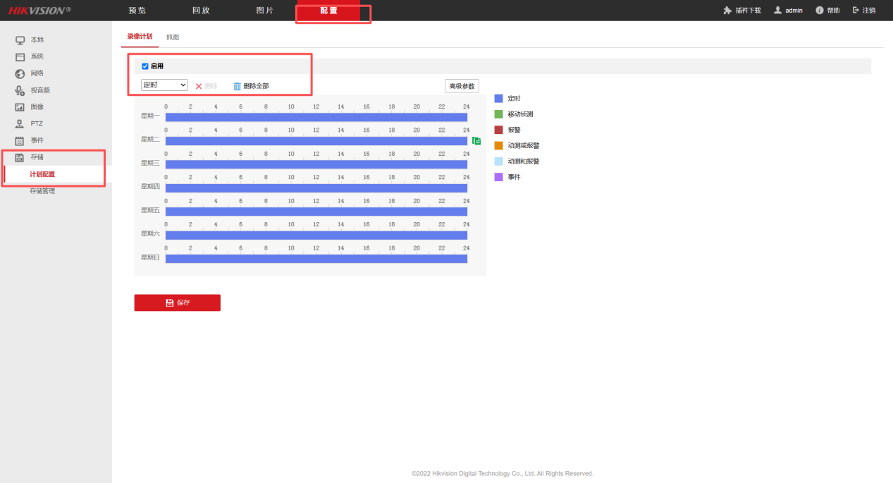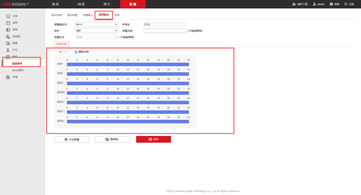 6、点击配置-事件-移动侦测,若有要求此功能,沟选启用次功能,选择移动侦测或遮挡报警,按实际情况进行区域画图,然后布防时间选择全天,联动方式选上传中心、报警输出联动、录像联动均√选。报警输出若接入了声光报警器,需按下图设置全天布防。