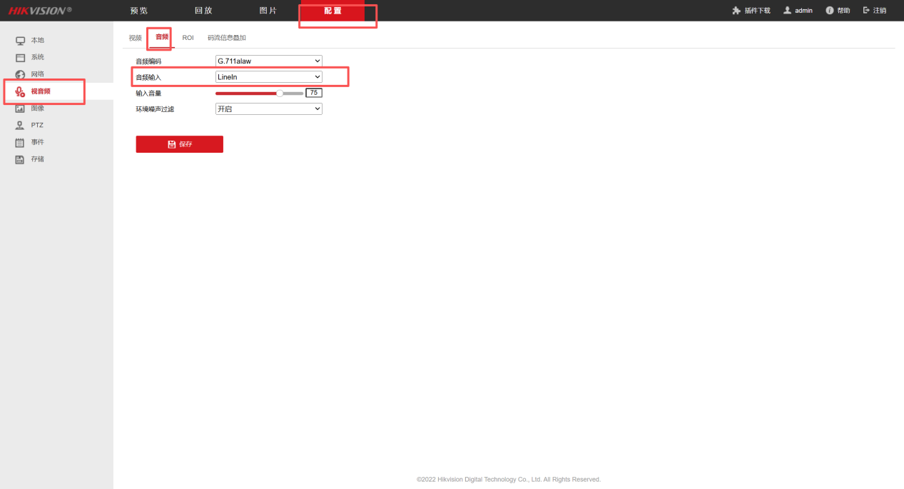 3、点击配置-视音频-视频、音频,一般情况下视频类型选择复合流,其他设置默认配置无需更改,若作业区或总站有要求,再按要求进行更改;若摄像头接入双向语音系统,音频输入选择接入设备,音频编码按设备情况,井站嘈杂,开启环境噪音过滤。