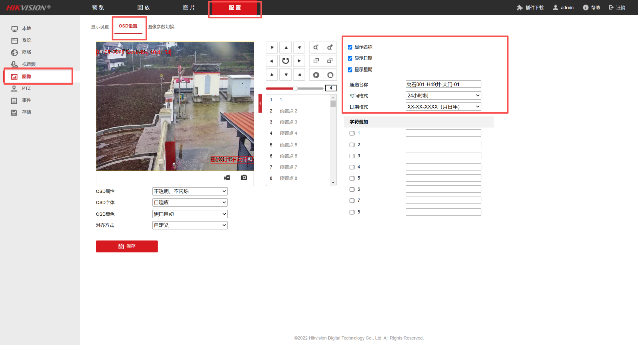 4、点击配置-图像-OSD设置,按要求配置通道名称(格式如:高石001-H49井-大门-01),显示日期、显示星期均√上,日期格式如图所示。