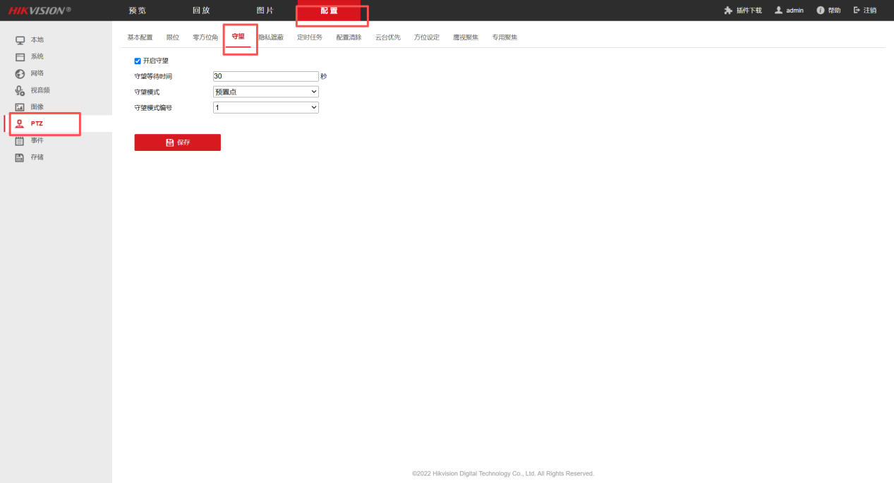 5、点击配置-PTZ-守望,按作业区要求进行设置。