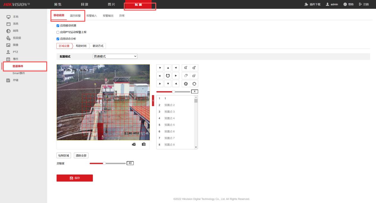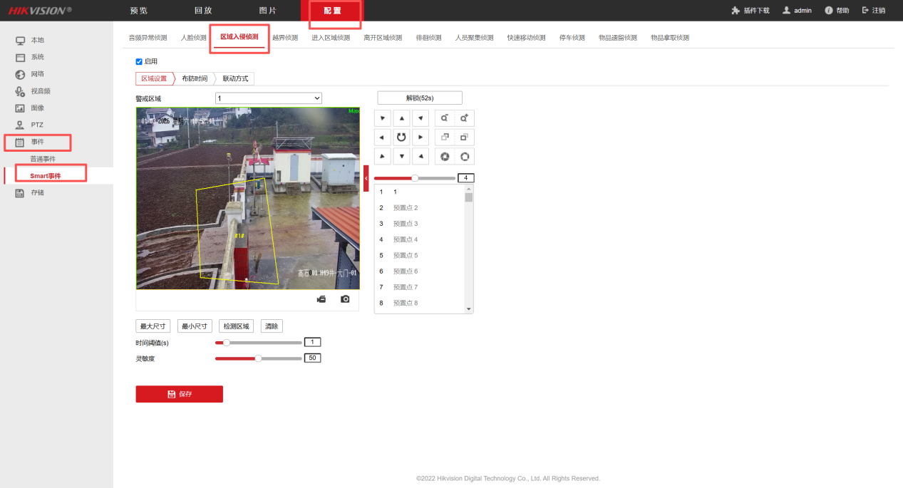 - 点击配置-事件-Smart事件-区域入侵侦测,若有此项功能要求,需设置开启,跟序号6功能类同配置。